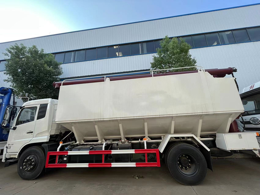 散裝飼料運(yùn)輸車,散裝飼料車的飼料罐架設(shè)在卡車的底盤(pán)上,罐頂開(kāi)有進(jìn)料口.頂部的一根螺旋輸送卸料管(俗稱卸料絞龍)則可自由回轉(zhuǎn)和抬升,抬升的仰角可達(dá)60度。運(yùn)輸時(shí),頂部的螺旋管平臥在罐頂;卸料時(shí)則抬起,使管端的出料口與畜禽飼養(yǎng)場(chǎng)貯料罐頂部的進(jìn)料門(mén)相接,駕駛室內(nèi)裝有操縱裝置(操縱裝置也可裝置在罐體尾部),卸料時(shí)通過(guò)車底的動(dòng)力輸出軸和減速器來(lái)驅(qū)動(dòng)螺旋,以完成卸料。