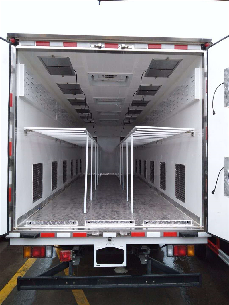 【豬苗車(chē)】上裝配置:外玻璃鋼,內(nèi)不銹鋼,兩層液壓升降層板,尾部液壓翻轉(zhuǎn)上豬平臺(tái),層板為不銹鋼骨架鋪鋁花紋板。外部電動(dòng)升降窗,排氣扇,柴油發(fā)電機(jī),暖風(fēng)加熱,喂水系統(tǒng),凈水箱、污水