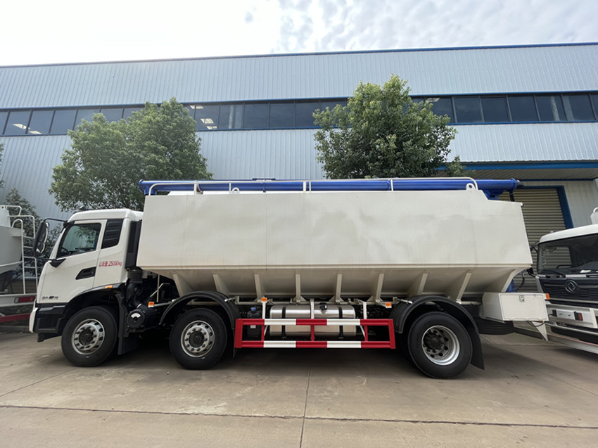 散裝飼料運(yùn)輸車,散裝飼料車的飼料罐架設(shè)在卡車的底盤上,罐頂開有進(jìn)料口.頂部的一根螺旋輸送卸料管(俗稱卸料絞龍)則可自由回轉(zhuǎn)和抬升,抬升的仰角可達(dá)60度。運(yùn)輸時(shí),頂部的螺旋管平臥在罐頂;卸料時(shí)則抬起,使管端的出料口與畜禽飼養(yǎng)場(chǎng)貯料罐頂部的進(jìn)料門相接,駕駛室內(nèi)裝有操縱裝置(操縱裝置也可裝置在罐體尾部),卸料時(shí)通過車底的動(dòng)力輸出軸和減速器來(lái)驅(qū)動(dòng)螺旋,以完成卸料。